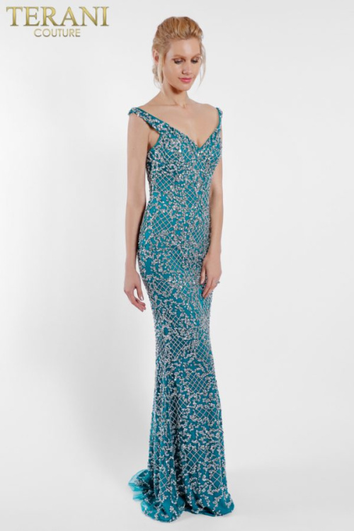 Длинное вечернее платье без рукавов, полностью инкрустированное бисером, разработанное Terani Couture