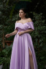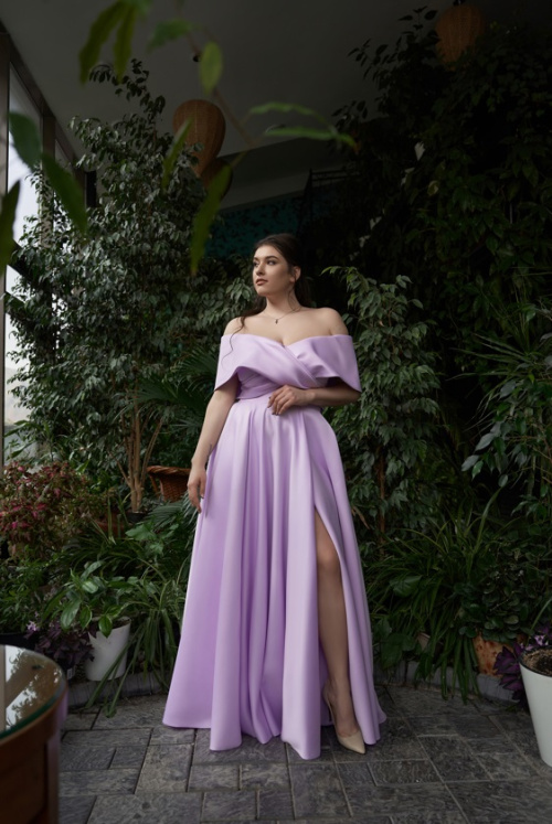 Обнаженное декольте подчеркивает изящные линии плеч и придает образу легкости. Неизменной фишкой платья является разрез по ножке, скрытый в складки струящейся юбки длиною в пол, а потайные карманы в швах предназначены специально для вашего удобства.