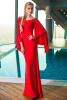 Изящное облегающее вечернее платье из джерси, вырез "лодочка". Особенностью платья является легкий ниспадающий рукав. Имеется шлейф.