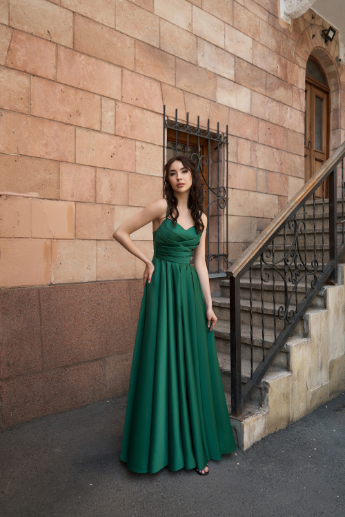 Платье в модном цвете представлено в длине макси с высоким разрезом по ножке. Главной особенностью, является корсетный лиф на шнуровке по спинке с актуальным вырезом в форме "сердечко", задрапированный в четкие складки
