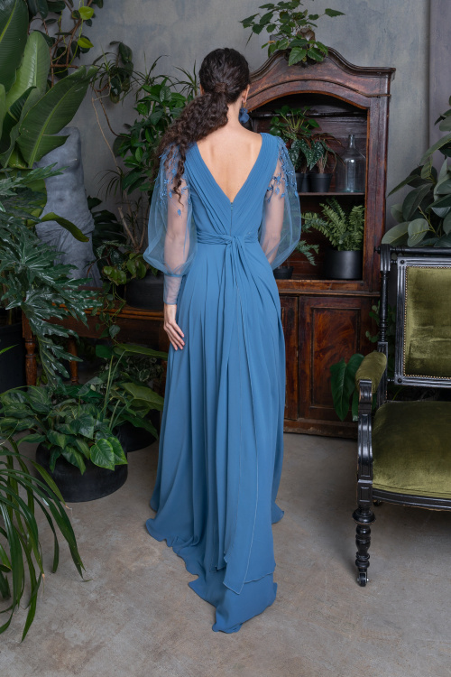 Элегантное платье для выхода в свет с изящным разрезом, прозрачными рукавами и цветной вышивкой. Подойдет как платье для мамы на свадебной церемонии.