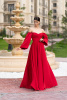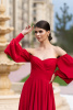 Универсальный вариант платья, подходящий для любого рода праздничных мероприятий. Пышный рукав и оголенные плечи делают талию еще более изящной, а юбка свободного кроя, развеваясь на ветру, соблазнительно приоткрывает ножку. А если смущаетесь открывать верх, то можно накинуть на плечи рукава-трансформеры