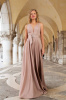 Вечернее платье А-силуэта с поясом и скрещенными на спине лямками.