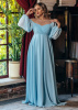 Длинное шифоновое платье свободного кроя. V-образный вырез по горловине визуально уменьшает плечи, перемещает акцент на декольте, а длинные шифоновые рукава - фонарики на резинке идеально дополняют образ. Идеальный вариант платья для девушек в «интересном» положении.
