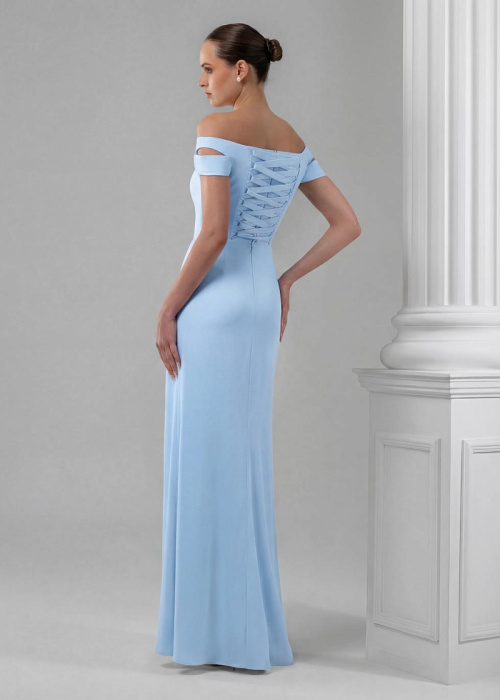 Элегантное длинное платье со спущенными плечами из магнуса. Длинная юбка на запах с высоким разрезом дополняет образ, а шнуровка по спинке делает максимально идеальную посадку. Платье полуприталенного силуэта замечательно подчеркивают фигуру, придавая образу женственный и соблазнительный вид.