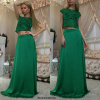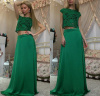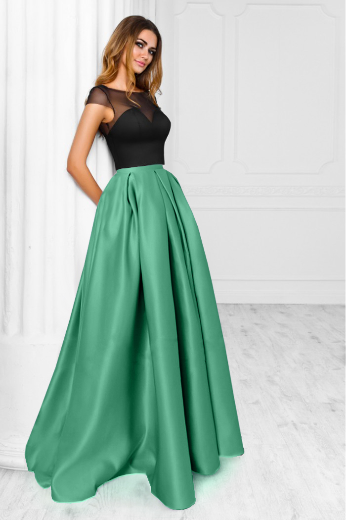Элегатное зелёное платье с атласной пышной юбкой и кружевным топом.