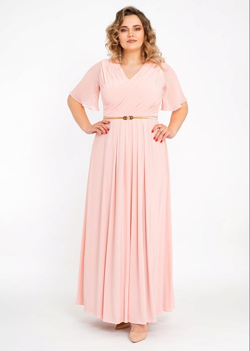 Длинное женское платье, классическое сочетание стрейчевого трикотажа и струящегося шифона прекрасно подойдет для девушек с пышными формами. Диагонально расположенные складочки запаха по линии декольте, эффектно подчеркивает все совершенства женской фигуры, а не большой рукавчик изящно прикрывает ручки. Линию талии подчеркивает съемный пояс - резинка.