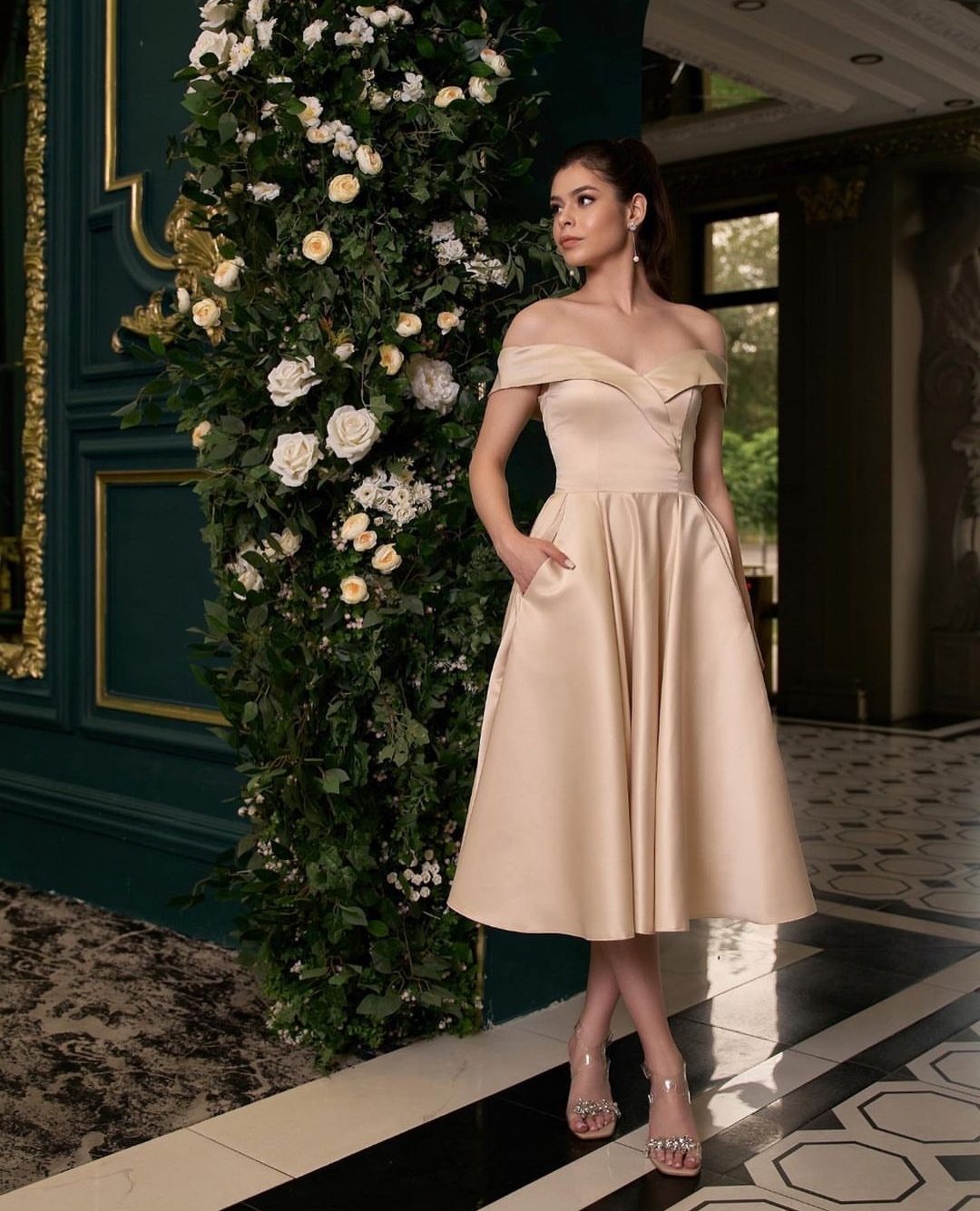 Золотистое коктейльное платье с открытыми плечами в длине миди. Прекрасное вечернее платье для вечеринки, выпускного бала или похода в изысканный ресторан. Сияйте и покоряйте сердце вашего избранника и ловите восхищенные взгляды окружающих.