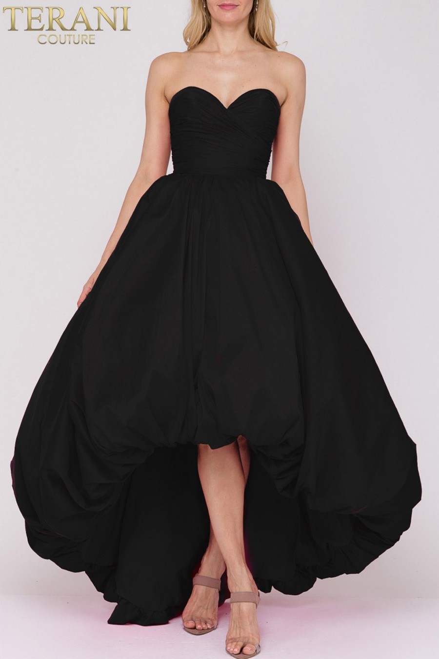 Милое платье для выпускного вечера с высокой и низкой пышной юбкой. Модная пышная юбка из легкой тафты с присборенным лифом с запахом и высоким низким низом.