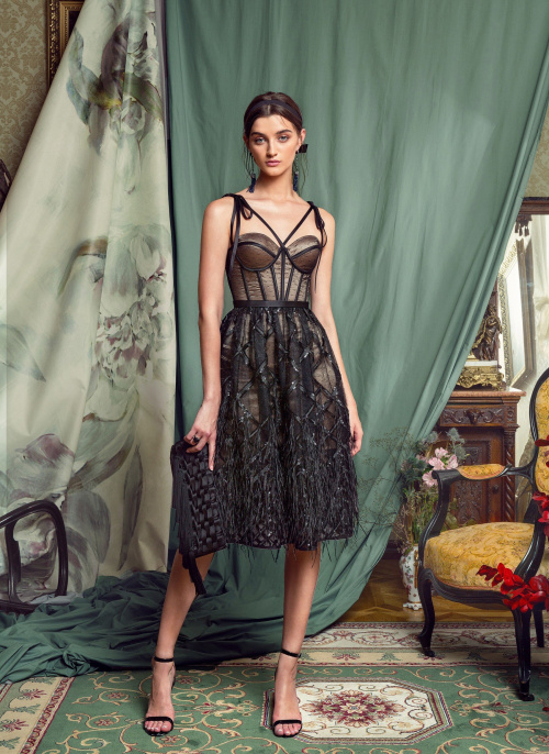 Чёрное миди с перьями и кружевом
