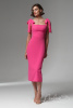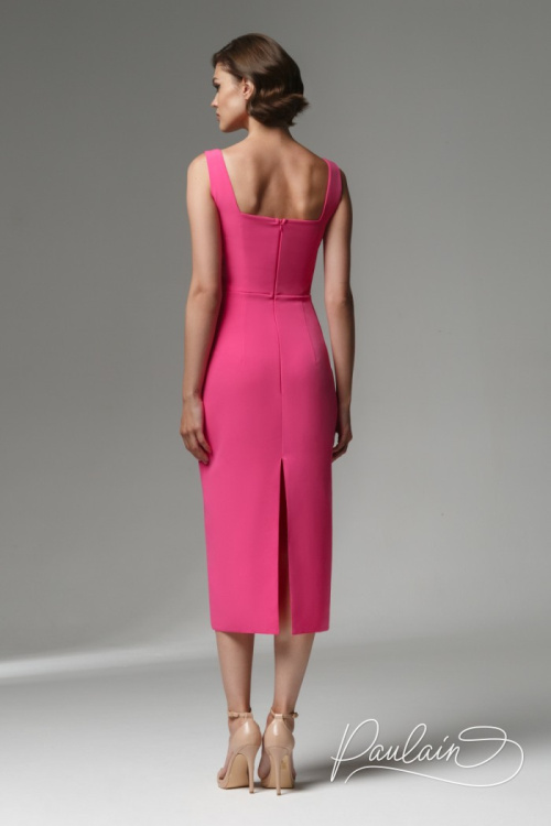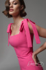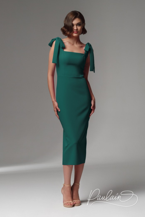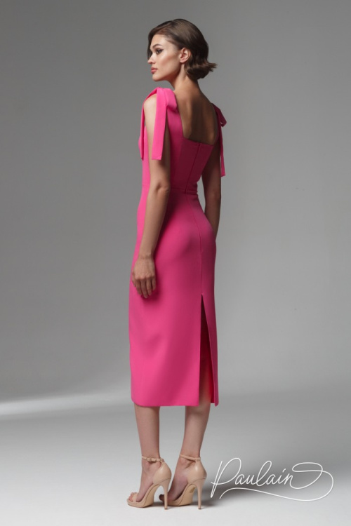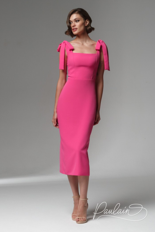 Силуэтное платье длины миди с вырезом-каре и съёмными бантами на широких лямках. Платье, максимально подчёркивающее изгибы фигуры, готовое стать главным элементом вашего вечернего гардероба. В этой модели плавные линии силуэта сочетаются с геометричной формой декольте. Сочный оттенок, приятная ткань и минималистический крой с лёгкими провокационными нотками — вот, что делает платье «Миша» лучшим выбором для особенного повода. Вырез-каре делает линию плеч особенно выразительной, а широкие лямки усиливают этот эффект, притягивая восхищённые взгляды Съёмные банты добавляют образу нужное настроение: наденьте их, если вам хочется быть более нежной и романтичной. Лёгкую пикантность платью придаёт элегантный высокий разрез, расположенный сзади.