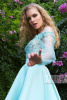 Коктейльное платье Влюблённая Нимфа с короткой атласной юбкой и кружевным верхом с рукавами украсит стройную фигуру. Кружевное декольте с открытыми плечами и длинными объёмными рукавами по краю обшито ажурной каймой. Верх без корсета с кружевной спинкой застёгивается на пуговицы. Ах, ты прекрасна!