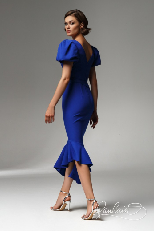 Элегантное миди на молнии с пикантным V-образным вырезом на спине. Его облегающая ткань подчеркнет женственные изгибы вашего тела, а стильные объёмные рукава и акцентный пояс на талии, усилят эффект. Силуэтная юбка с ассиметричным отрезным воланом придает платью романтичности, женственности и немного кокетства. При ходьбе, волнующие движения воланов, создают эффект летящей походки и легкости. Почувствуйте себя точеной хрупкой статуэткой в силуэтном платье Эшли.