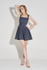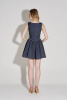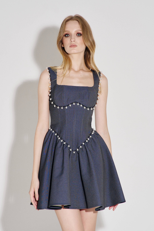 Платье женское, из костюмно-плательной ткани, полуприлегающего силуэта, с застежкой на потайную молнию, расположенную в среднем шве спинки. Лиф и средняя часть переда фигурной формы, с двумя парами вертикальных рельефов, средняя часть со средним швом. В шов притачивания лифа и средней части переда вставлена декоративная тесьма с бусинами. Верхняя часть спинки с вертикальными рельефами. Нижняя часть переда и спинки со сборкой. Горловина переда фигурной формы. Платье на подкладке.