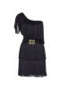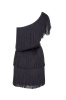 Чёрное мини платье на одно плечо с бахромой и золотым поясом, прекрасно подчёркивающий талию.