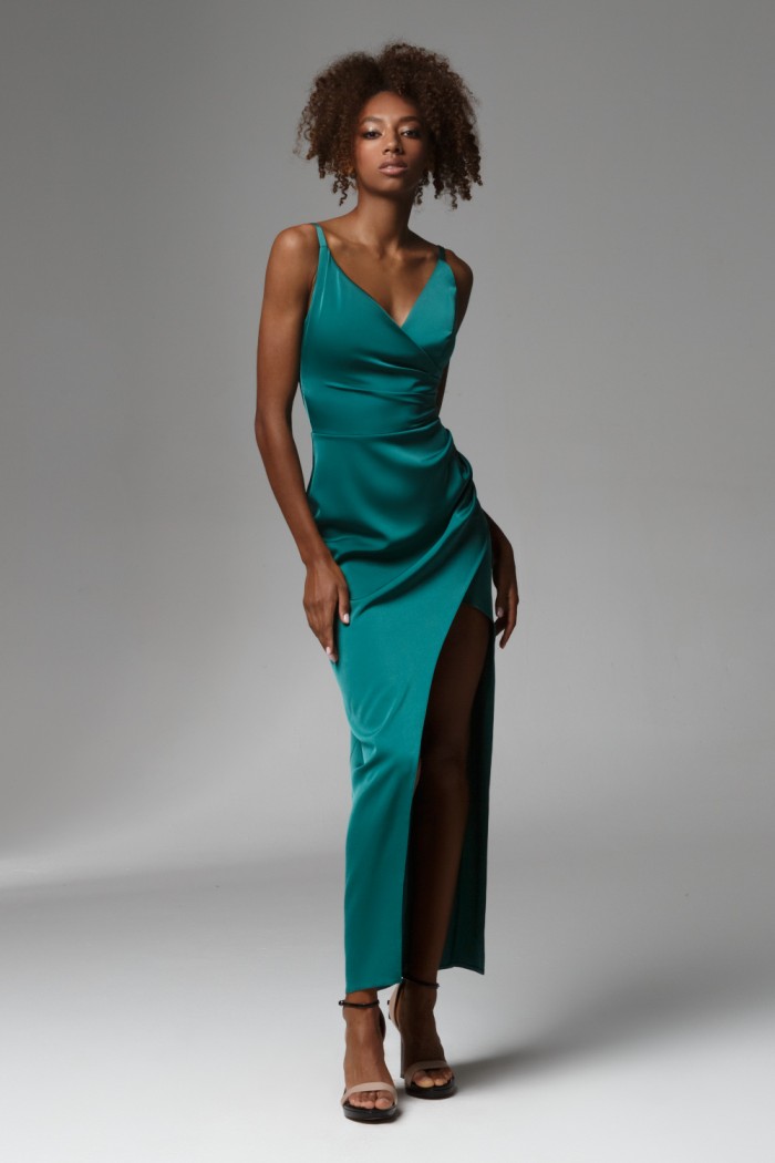 Пластичное вечернее платье с оптическим эффектом максимально длинных ног. Ультра-сексуальная модель из завораживающего креп-сатина актуальной длины 7/8 выполнена в глубоком изумрудном цвете. Высокий разрез поддерживает трендовую тенденцию на соблазнение. Тот самый случай, когда не требуется играть в таинственность, чтобы сохранить элегантность. V-образный вырез лифа с мягкой драпировкой — ещё одна эффектная деталь, в сочетании с тоненькими лямками превращающая эту модель в must wear dress для светского мероприятия любого ранга. Получается, вам оно совершенно необходимо!