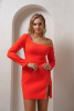 Роскошная утонченная модель облегает фигуру, создавая женственный и величественный силуэт. Объемный жгут из страз, украшающий линию плеч и разрез по ножке, придает образу невероятную элегантность, а открытые плечи и юбка на запах - это история про утонченность и изысканность.