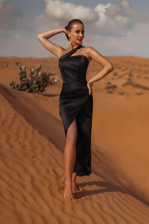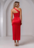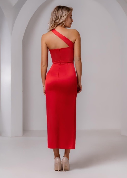Элегантное вечернее платье из магнуса длины миди приталенного силуэта. Оригинальность модели придает перекрестная лента на плече, которая подчеркивает красоту, делая образ более выразительным.