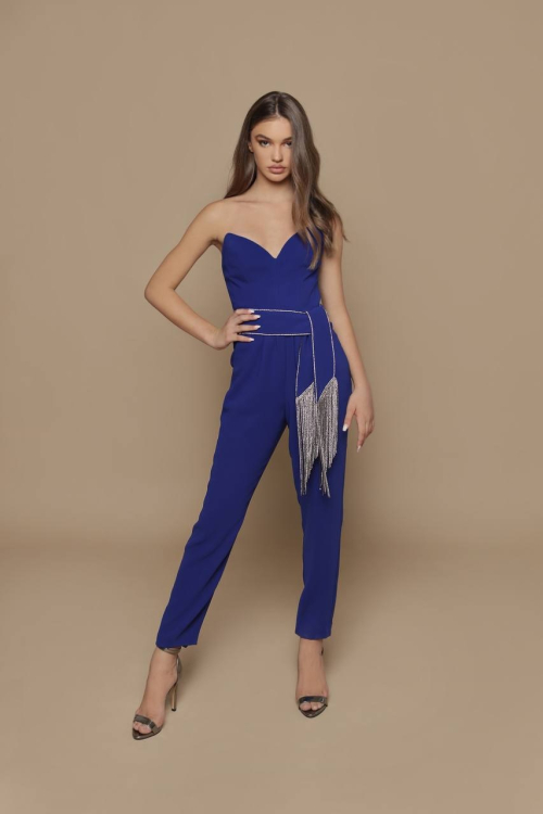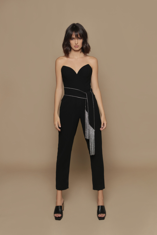 Отличная модель для тех, кто хочет добавить изюминку в свой базовый стиль. Модель без бретелек находится в стильном единстве с брючным кроем «сигарета». Его вышитый камнями пояс с кисточками придаст вам блеск, который вы хотите иметь.