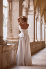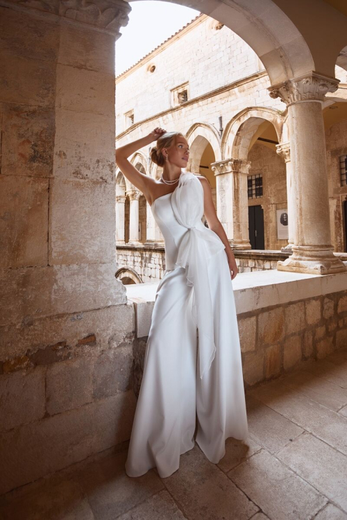 Элегантный минималистичный костюм из атласа. Верх костюма оформлен в виде корсета с элегантной драпировкой из фатина. Длинная драпировка украшена жемчугом. Прямой вырез корсета и открытые плечи акцентируют внимание на зоне декольте. Длинные широкие брюки завершают образ