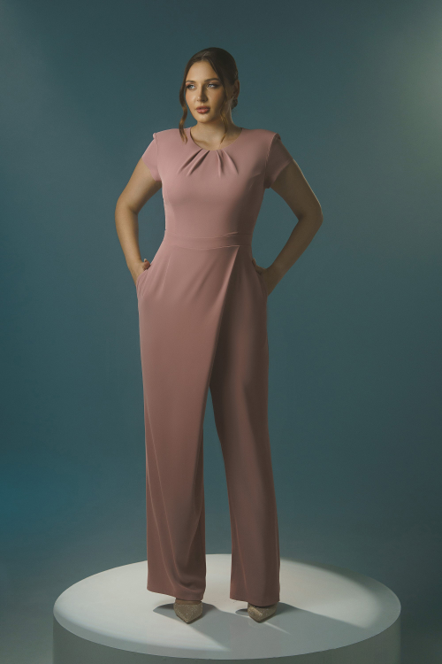 Идеальный вариант для тех, кто стремится быть в центре внимания! Комбинезон из очень красивого текстиля крепового плетения со струящимся эффектом спереди.