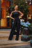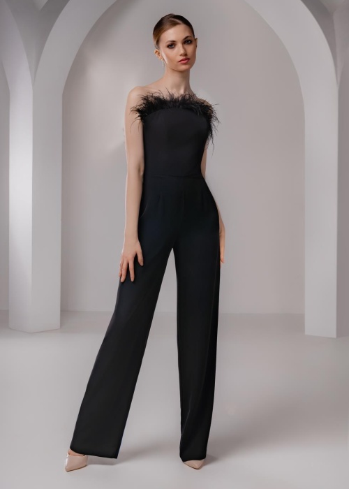 Элегантный вечерний комбинезон из шелк- плазмы. Открытые плечи, декольте, интригующе подчеркивающее грудь, а слегка зауженные брюки подчеркивают красоту и стройность ног. Украшением данной модели являются страусиные перья по лифу– все это утонченно обыграно, выглядит сногсшибательно и изыскано.