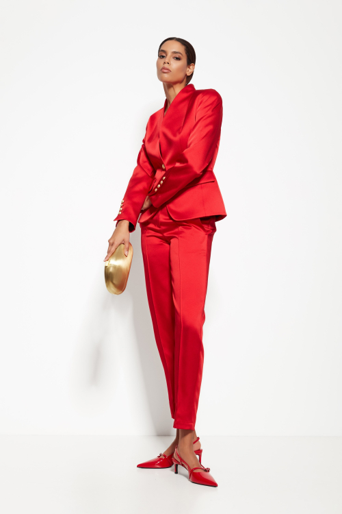 Модель из коллекции Party 2026 — жакет из ткани с эффектным блеском, застёгивающийся на одну золотую пуговицу. Приталённый силуэт подчёркивает фигуру, а лаконичный дизайн делает модель универсальной для различных образов.