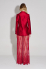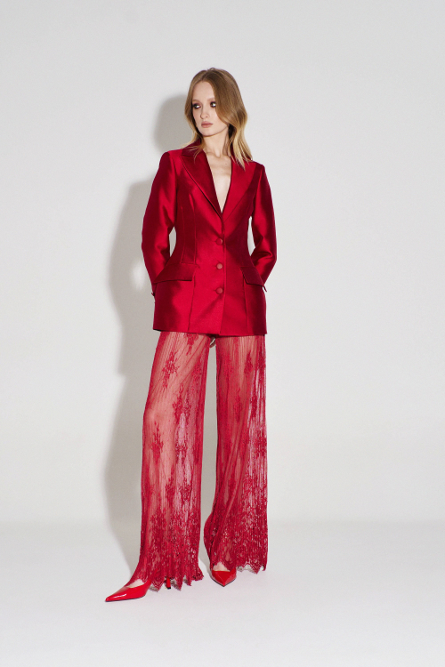 Жакет женский однобортный с прямы по низу бортами с застежкой на петли и пуговицы. Перед с центральными рельефами идущими из проймы и вытачками на боковых частях переда, и боковыми прорезными карманами с клапаном и одной обтачкой. Воротник и лацканы отложные. Спинка со швом по середине и рельефами идущими из проймы. Рукава со шлицей. На шлицах пришиты пуговицы. Жакет на подкладке.Брюки женские из кружевной ткани, прямые, на притачном поясе (пояс из эластичной тесьмы).