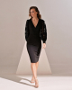 Вечернее платье-футляр с открытой спиной, объемными воздушными рукавами из кружева, красивым V-образным вырезом и подчеркнутой талией. В этой модели соединено все, что делает ваш образ утонченным и привлекательным.