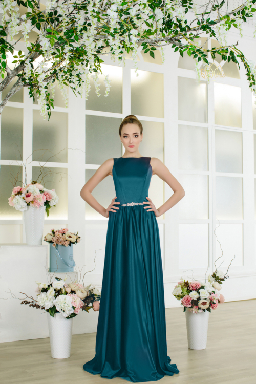 Платье длинное, вечернее. Юбка присборена по линии талии, декорирована поясом, расшитым стразами.