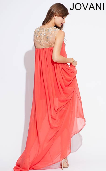 Длинное вечернее платье в пол "А- силуэта" Jovani 90716 A. Верх выполнен из сетки, которая расшита стразами и бисером. Платье выполнено из легкого прозрачного шифона, имеется облегающий подклад из атласа.