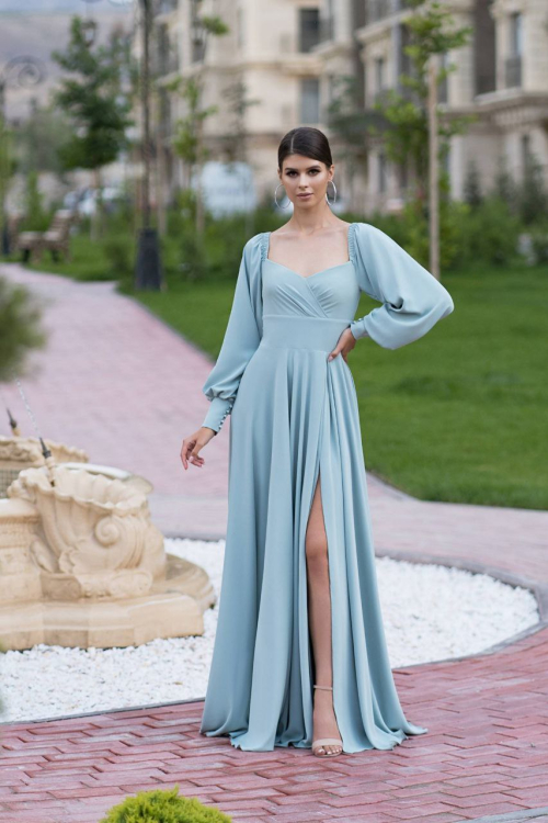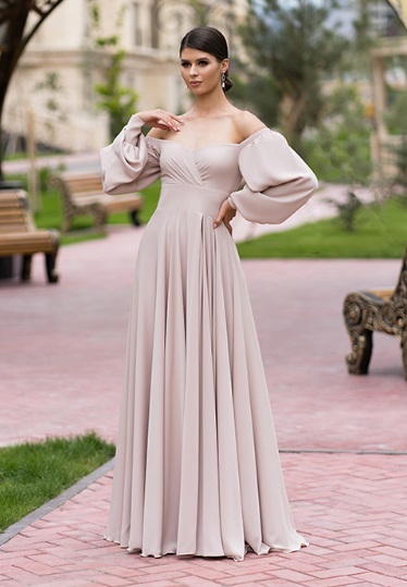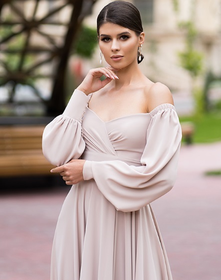Универсальный вариант платья, подходящий для любого рода праздничных мероприятий. Пышный рукав и оголенные плечи делают талию еще более изящной, а юбка свободного кроя, развеваясь на ветру, соблазнительно приоткрывает ножку. А если смущаетесь открывать верх, то можно накинуть на плечи рукава-трансформеры