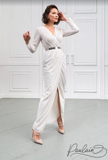 Блестящее длинное платье с разрезом на ноге Гера стильный хит данного сезона. Модель с лаконичными длинными рукавами на талии схвачена гладким металлическим поясом. Небольшой V-образный вырез в области декольте выглядит утончённо, он органично сочетается с прямыми рукавами. Модель также представлена в больших размерах.
