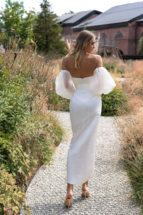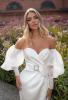 То самое свадебное платье с объемными рукавами, которые так популярны, и могут быть дополнением к платью вместо накидки или шали. Облегающий силуэт, лиф в форме сердца. центральный разрез от колена и широкий пояс - абсолютное комбо для вашего уникального образа!