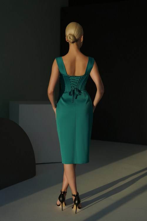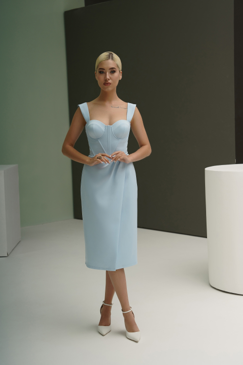 Эффектное платье на широких бретелях с вырезом в форме сердца и соблазнителным разрезом.