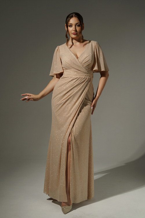 Утонченность и роскошь это то, что первое приходит в голову при виде этого платья! Обворожительная рыбка из сияющего глиттера стала номером один среди вечерних нарядов! Полуоблегающий силуэт подчеркнет все достоинства прекрасной фигуры девушек и женщин размера плюс сайз. Приспущенные рукава придают образу той самой игривости. Разрез по ножке добавляет образу сексуальности, чего так хотят добиться нынешние красотки! Платье подойдет как невесте подругам невесты так и их очаровательным мамам,