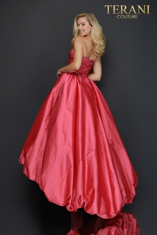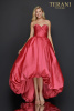 Милое платье для выпускного вечера с высокой и низкой пышной юбкой. Модная пышная юбка из легкой тафты с присборенным лифом с запахом и высоким низким низом.