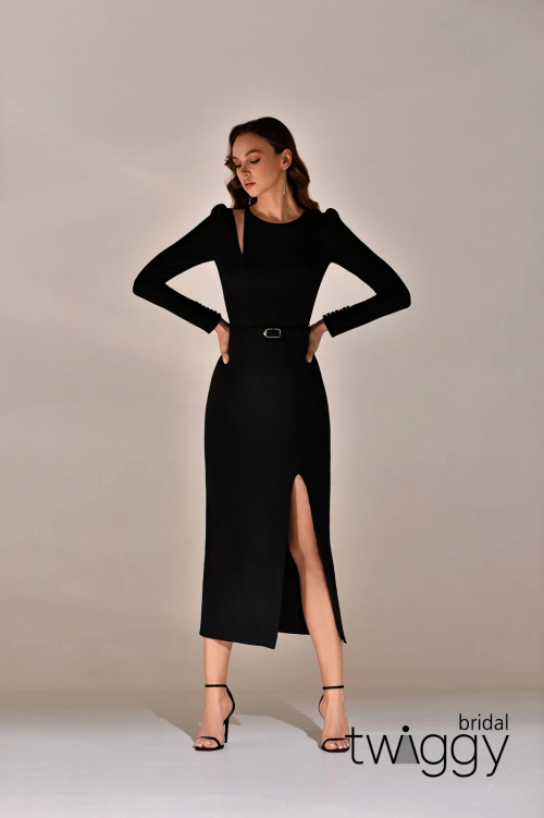 Лаконичное прямое платье в длине миди с разрезом на ноге, идеально подойдет для вечера в ресторане