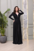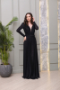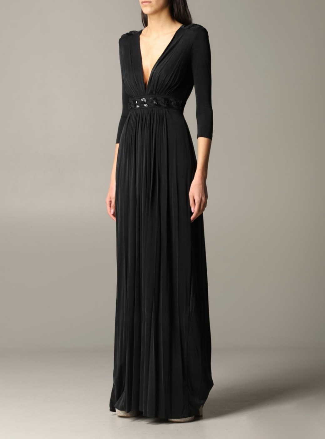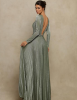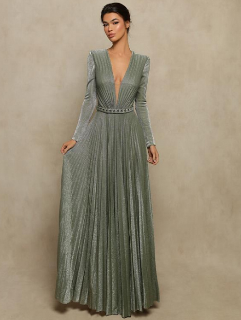 Складки с тонкими краями выполнены из сверкающего джерси, талия подчеркнута эффектным плетеным поясом. Платье с длинными рукавами и эффектной открытой спиной.