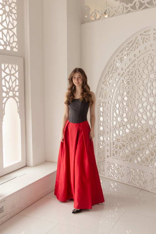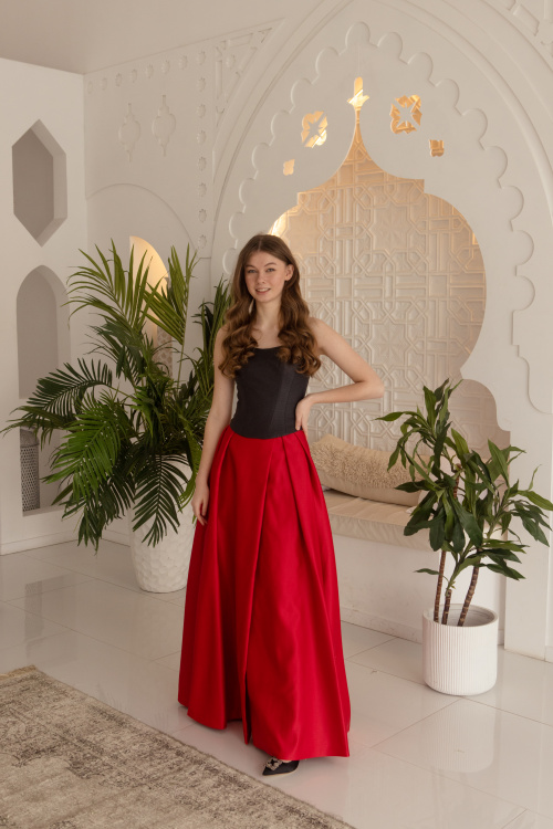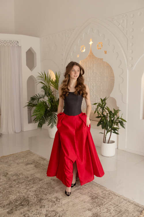 В чём секрет подлинной красоты? В том, что она не угасает со временем, а напротив – освещает мир вокруг себя с удвоенной силой. Именно такой впечатляющей внешностью обладает Первая леди Италии Аньезе Ландини – ещё одна муза нашей коллекции. Её образ подсказал идею для этого слегка экстравагантного комплекта, решённого в монохромной цветовой гамме: архитектурный топ-корсет, выполненный из эко-кожи с мягким блеском