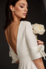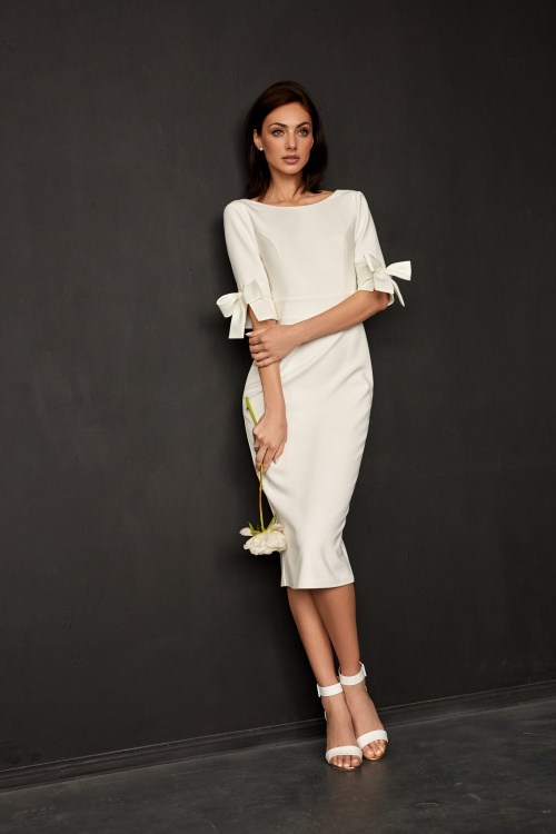 Сдержанное и элегантное платье-футляр из крепа. Его особенность - это чистые линии, глубокий вырез на спине и игривые бантики на рукавах.