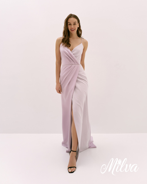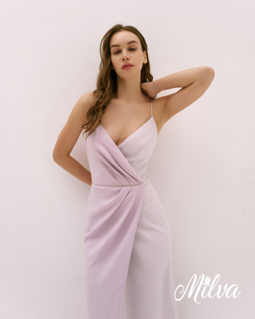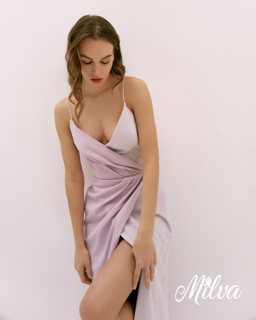 Новый модный взгляд на одежду! Если ты любишь сочетать разные ткани в одном образе - тебе определенно понравится этот наряд. Это удивительное платье создано из двух контрастных частей. Та, что внутри, покрыта блестками и облегает тело. Вторая наружная половина платья, словно тень, обволакивает изгибы фигуры и дополняет образ сдержаной элегантностью. Платье представлено в лавандовых оттенках.