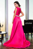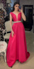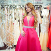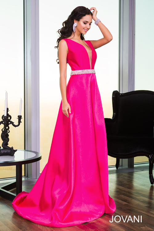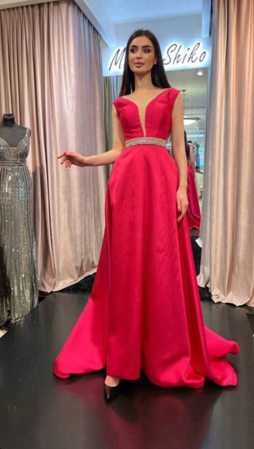 Яркое вечернее платье в пол "А- силуэта"  выполнено из атласа, талия декорирована поясом из камней. Спина закрытая, имеется небольшой шлейф.