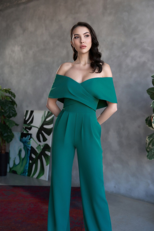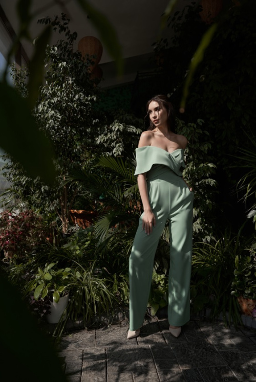 Модель выполнена из костюмной ткани с плотным лифом, который отлично держит грудь и подчеркивает всю женственность за счет открытых плеч и отлетного воротника.