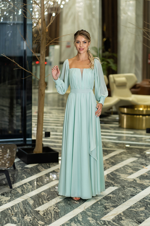Мятное шифоновое платье с рукавом