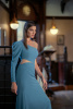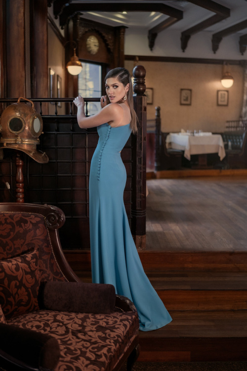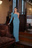 Эксклюзивное платье на одно плечо с прозрачными вставками на талии создает впечатление ассиметричного комплекта. Линия бедер подчеркнута пуговицами и плавно соскальзывает в расширяющуюся юбку с небольшим шлейфом.
