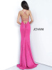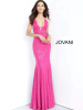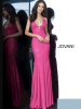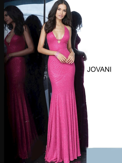 Вечернее платье цвета фуксии Jovani 02781 имеет глубокий вырез с перекрещивающимися деталями и тонкими бретельками по краям, образующими открытую спину со шнуровкой. Это узкое блестящее платье с расклешенной юбкой заканчивается легким шлейфом.