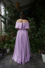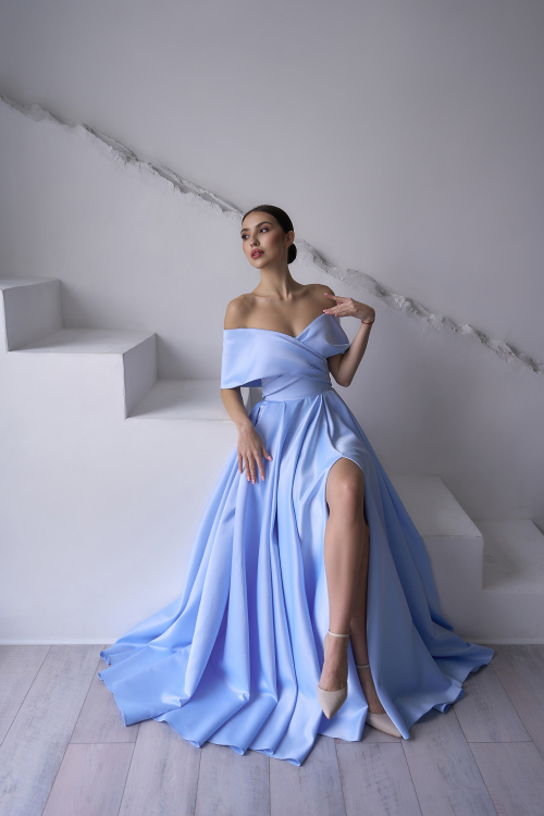 Обнаженное декольте подчеркивает изящные линии плеч и придает образу легкости. Неизменной фишкой платья является разрез по ножке, скрытый в складки струящейся юбки длиною в пол, а потайные карманы в швах предназначены специально для вашего удобства.