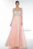 Длинное вечернее платье с многослойной шифоновой юбкой, без бретелей. Лиф украшен стразами и вышивкой.