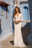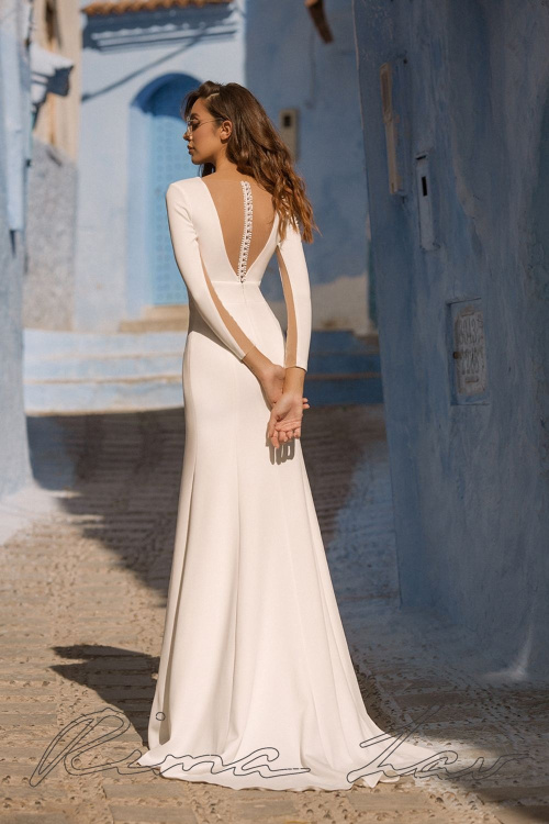 Лаконичное платье Эвелин. Фасон рыбка с длинной юбкой элегантно подчёркивает фигуру. В модели с длинным рукавом преобладают минимализм и прямые строчки. Верх без корсета с V вырезом дополнен полупрозрачными вставками, которые имитируют открытую спину. Такими же вставками украшены и рукава.
